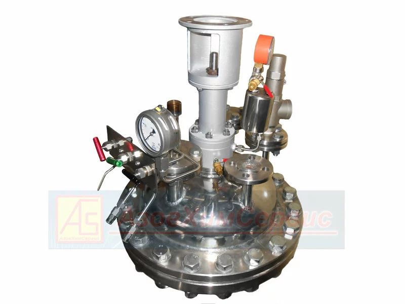 На фланце крышки реактора нержавеющего установлена консоль с манометром и тремя штуцерами с запорной арматурой,которые могут использоваться для отбора проб,подачи газов или для других ,необходимых технологам целей.